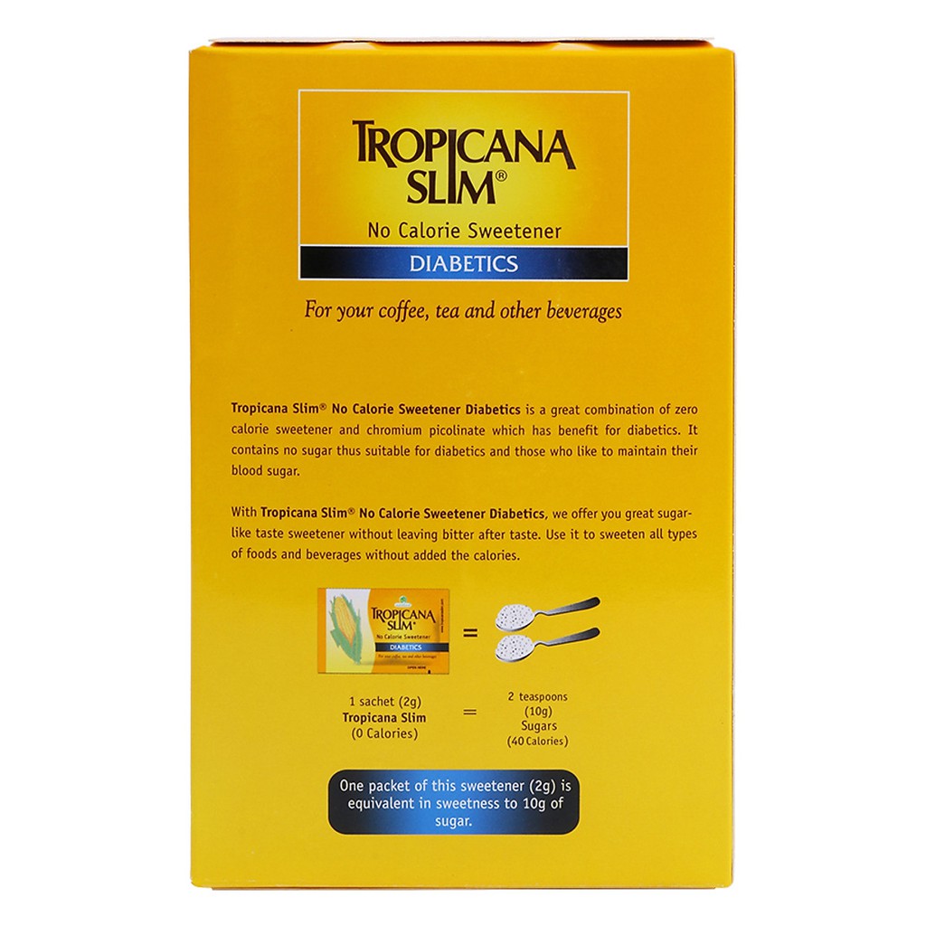Miễn phí đổi trả nếu bán hàng kém chất lượng. Hiện tại Hộp 50 Gói Đường bắp ăn kiêng không calo Tropicana Slim Diabetics Dành Cho Người Tiểu Đường, Ăn Kiêng Healthy, Eatclean đang được giảm giá chỉ còn 64,170đ. Số lượng có hạn hãy nhanh tay đặt khi còn hàng bạn nhé
